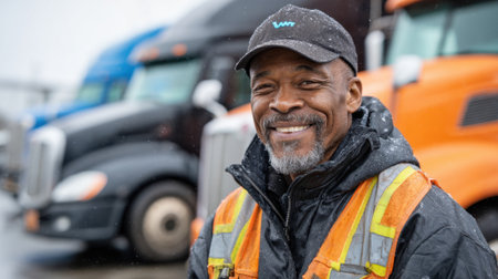 A man in an orange safety vest stands in front of a large truck. Concept of strength and determination, as the man is ready to take on a challenging task