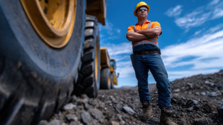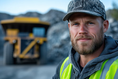 Portrait of a male miner standing in front of a mining truck