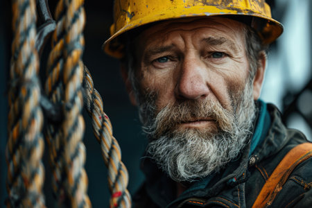 Close-up of an experienced construction worker with a yellow hard hat and stern expression