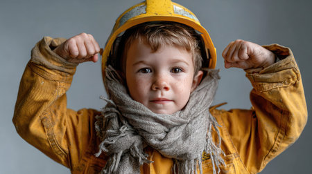 A young boy confidently poses in workwear and a helmet, showcasing his strength and determination with a playful expression, evoking imagination and dreams.