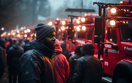 Confident female firefighter in red uniform standing with team near fire truck, symbolizing courage and teamwork.