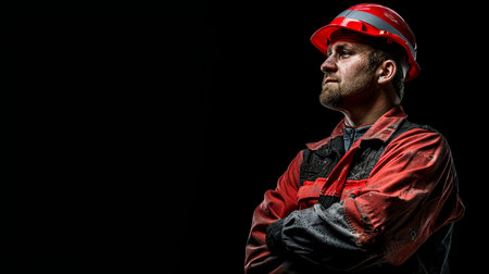 Portrait of a worker in a red helmet on a black background