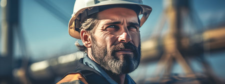 oil rig worker man portrarit with industrial construction in the background wearing helmet