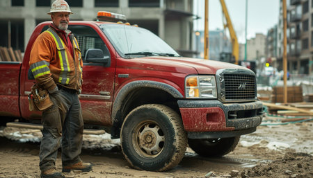 The construction worker is standing next to a red truck at the construction site. The vehicle has four tires, automotive parking lights, and a grille