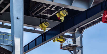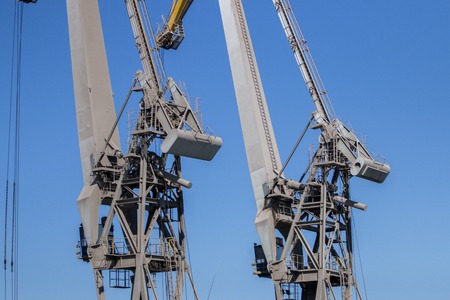 Modern coal terminal in Riga, Latvia. Cranes close-up. Baltic sea. Freight transportation, logistics, global communications, economy, business, industry, supply, special equipment. Urban landscape