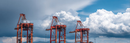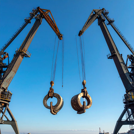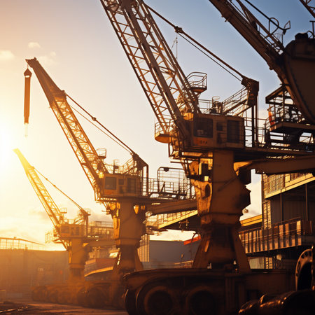 Vibrant industrial scene of shipping cranes in a port, reflecting the critical role of heavy machinery in global logistics and trade operations, set against a bright blue sky.