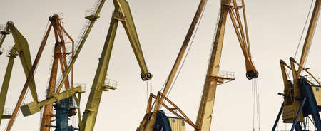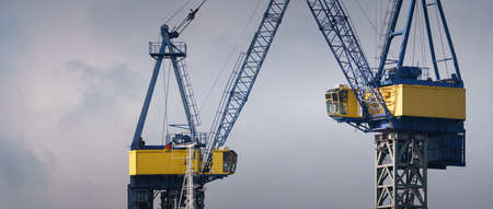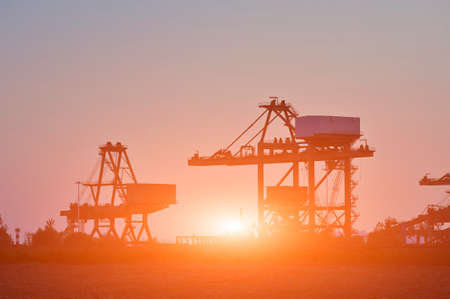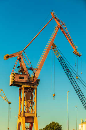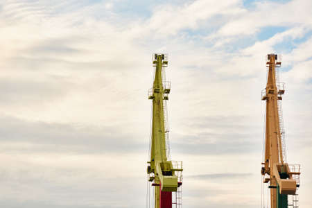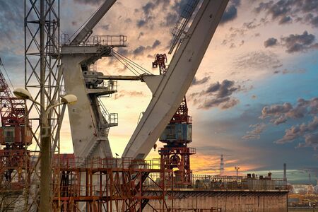 Cargo port terminal in Ventspils, Latvia. Cranes close-up. Baltic sea. Dramatic sunset sky. Freight transportation, logistics, global communications, business, industry, supply, special equipment
