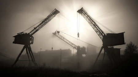 This striking black and white image features silhouetted industrial cranes emerging from a foggy landscape, creating a dramatic atmospheric effect.