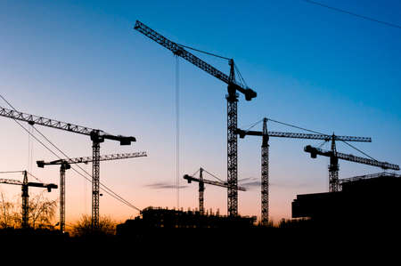 Silhouette of construction cranes over new construction landmark buildings at sunset. Urban background