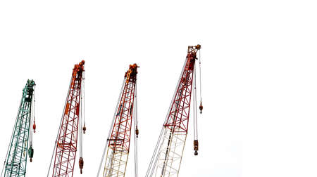 Set of big construction crane for heavy lifting isolated on white background. Construction industry. Crane for container lift or at construction site. Crane rental business concept. Crane dealership.