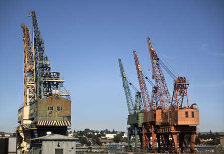 Business and commerce. Heavy load dockside cranes in port, cargo container yard. Industrial scene