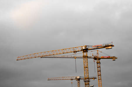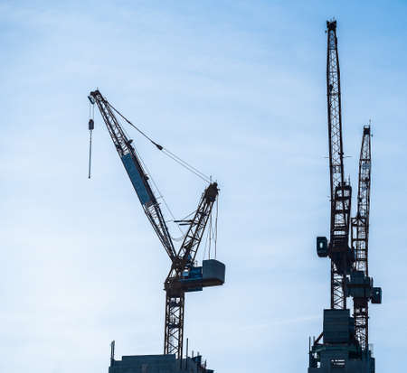 photographed close-up construction cranes during construction of a new multi-storey apartment building, blue sky and clouds,