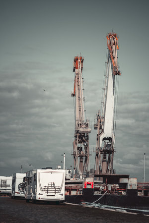 Industrial harbor scene featuring two tall dockside cranes with orange accents, motorhomes parked nearby, cloudy sky background, maritime and industrial transportation concept; telephoto low-key shot
