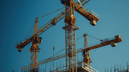 Majestic Tower Cranes Against a Bright Blue Sky in an Urban Construction Site Setting