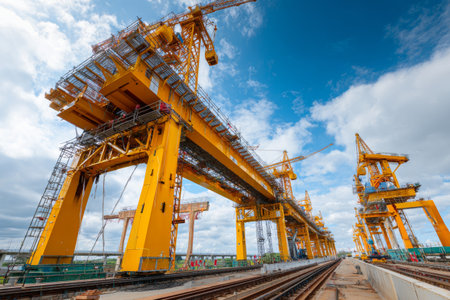 Workers are actively engaged at a construction site featuring towering yellow cranes amidst a backdrop of clouds. Metal structures dominate the area as rail tracks are visible.