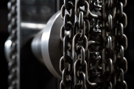 A detailed close-up image showcasing an industrial gear mechanism featuring metal chains and components, capturing the essence of modern manufacturing and engineering.