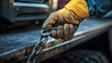 Detail of a gloved hand fastening a cargo chain hook, ensuring the load is stable and secure on the truck bed.