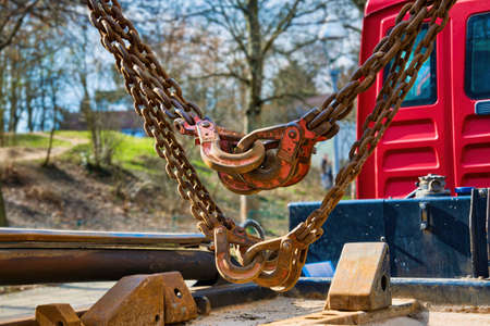 Berlin, Germany - March 5, 2022: Massive and rusty chains and hooks on the load area of a truck.