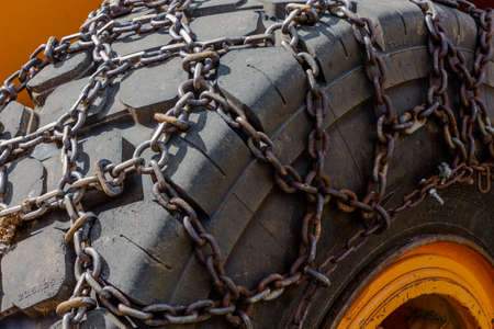 Traction chains on the big wheel of a forest log truck tree harvester working woodcutter.