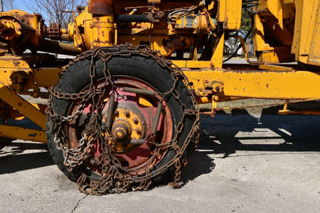 A wheel on a homemade snowblower is full of rusty chains and springs in an effort to gain traction.