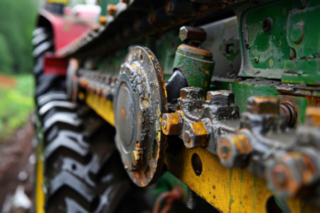 A large, rusty, and dirty yellow machine with many bolts and nuts. The machine appears to be a piece of heavy equipment, possibly a bulldozer or a crane. Scene is one of wear and tear
