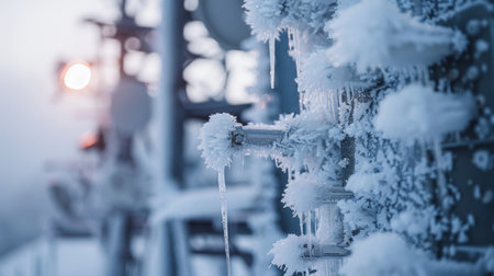 Winter Frost Covers Communication Towers at Sunrise in a Remote Area, Highlighting the Contrast Between Icy Details and Warm Light. Generative AI