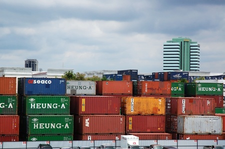 view on top of containers shipping warehouse with business building background at Bangkok,Thailand on August,2010
