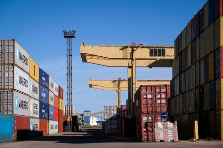 NUREMBERG / GERMANY - AUGUST 4, 2019: Shipping containers stands on TriCon Container Terminal Nuremberg.