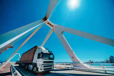 Big truck on a modern bridge. Wide angle view with blue sky.