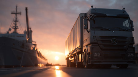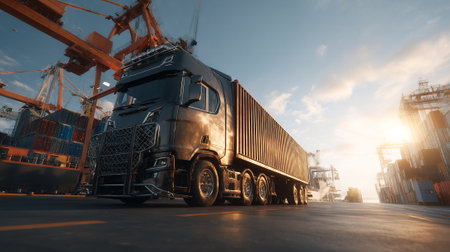 A freight truck parked by a shipping port at sunset, showcasing cranes and containers in the background. The scene captures the essence of logistics and transportation.