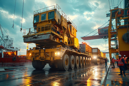 Witness the seamless movement of goods as containers are efficiently transported from the port to a cargo plane in this dynamic image. Trucks lined up, ready to embark on their journey, showcase the intricate logistics involved in global trade. The containers, securely stacked, symbolize the vast volume of goods being transported. This photograph captures the synchronized efforts and efficiency of the supply chain. Perfect for transportation, logistics, and business-related projects, this image encapsulates the seamless flow of commerce and the interconnected nature of the global economy.