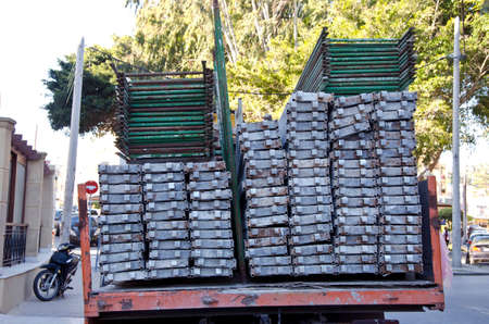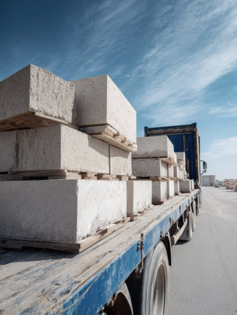 Concrete blocks stacked neatly on a freight truck, ready for transport, with a bright and clear sky overhead in a construction area