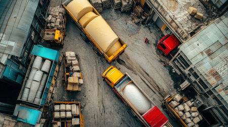 This image captures a bustling industrial scene with cargo trucks actively loading and unloading materials in a well-organized warehouse setting.