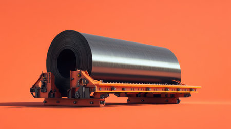 A striking visual of an industrial transportation scene featuring a metal coil on a flatbed rail car against a vibrant orange background, showcasing machinery design.