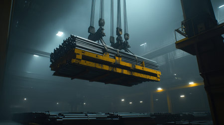 An industrial scene featuring a crane lifting heavy steel beams inside a warehouse, showcasing a blend of technology and construction in an atmospheric setting.