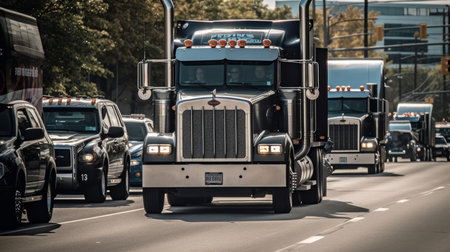 An image of large semi truck on city street. TRANSPORT SAFETY. Generative AI.