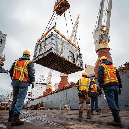 Industrial workers unloading cargo containers in shipyard, freight transportation concept