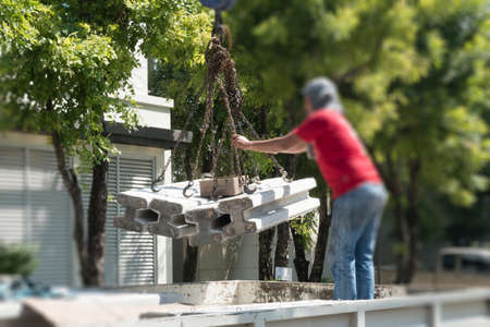 Construction worker move concrete stake from truck in construction site