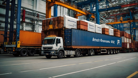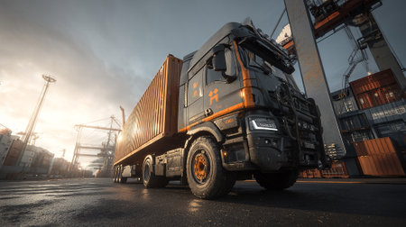 Digital Freight: Futuristic Truck Transport at Port with Data Visualization