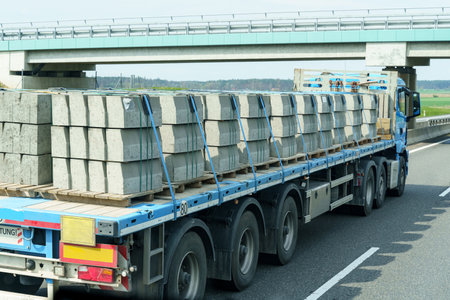 Truck on the highway transports concrete products - curbs. Import, export, logistics, industrial transport.