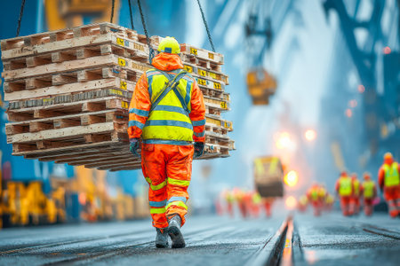 Worker in bright safety gear carries wooden pallets through a bustling industrial area, showcasing teamwork and diligence.