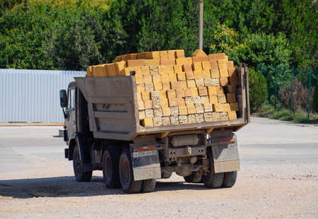 Taman, Russia - July 9, 2019: Transportation of blocks of limestone shell by the truck.
