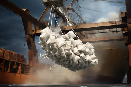 A crane effortlessly raises a hefty amount of cement at a bustling construction site, Ship crane lift-off slings of sugar bags cargo from truck and load into ship, AI Generated