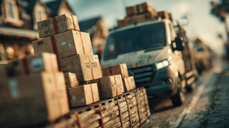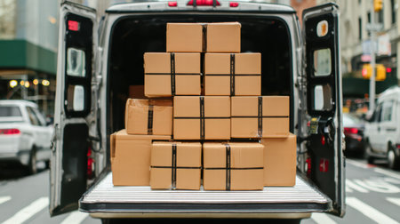 Delivery truck in motion on an urban street surrounded by stacked cardboard boxes.