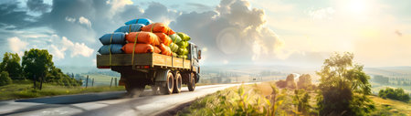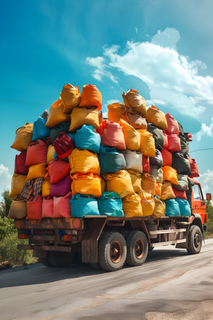 Cargo truck full of colorful bags on the road in the countryside and sunset.