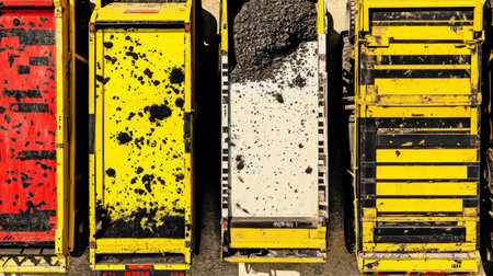 Aerial Shot of Construction Trucks with Asphalt and Bold Yellow Patterns.