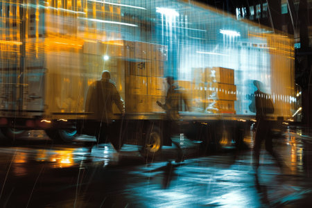 An abstract image of movers unloading boxes from a container truck at night