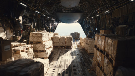 Inside a military transport aircraft, rows of green cargo crates are stacked securely. The environment showcases an organized layout, ensuring safe transportation of items.