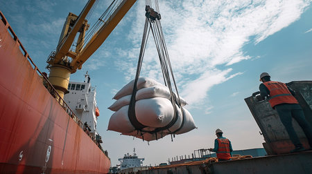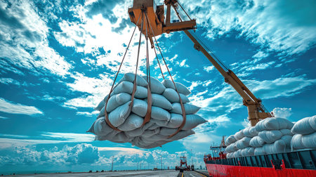 A crane lifts heavy cargo sacks onto a ship against a stunning blue sky. This image captures the essence of commercial shipping and logistics.