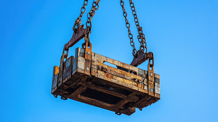 A heavy industrial loader hangs suspended by chains against a blue sky. This image showcases machinery used in construction and transportation of cargo.